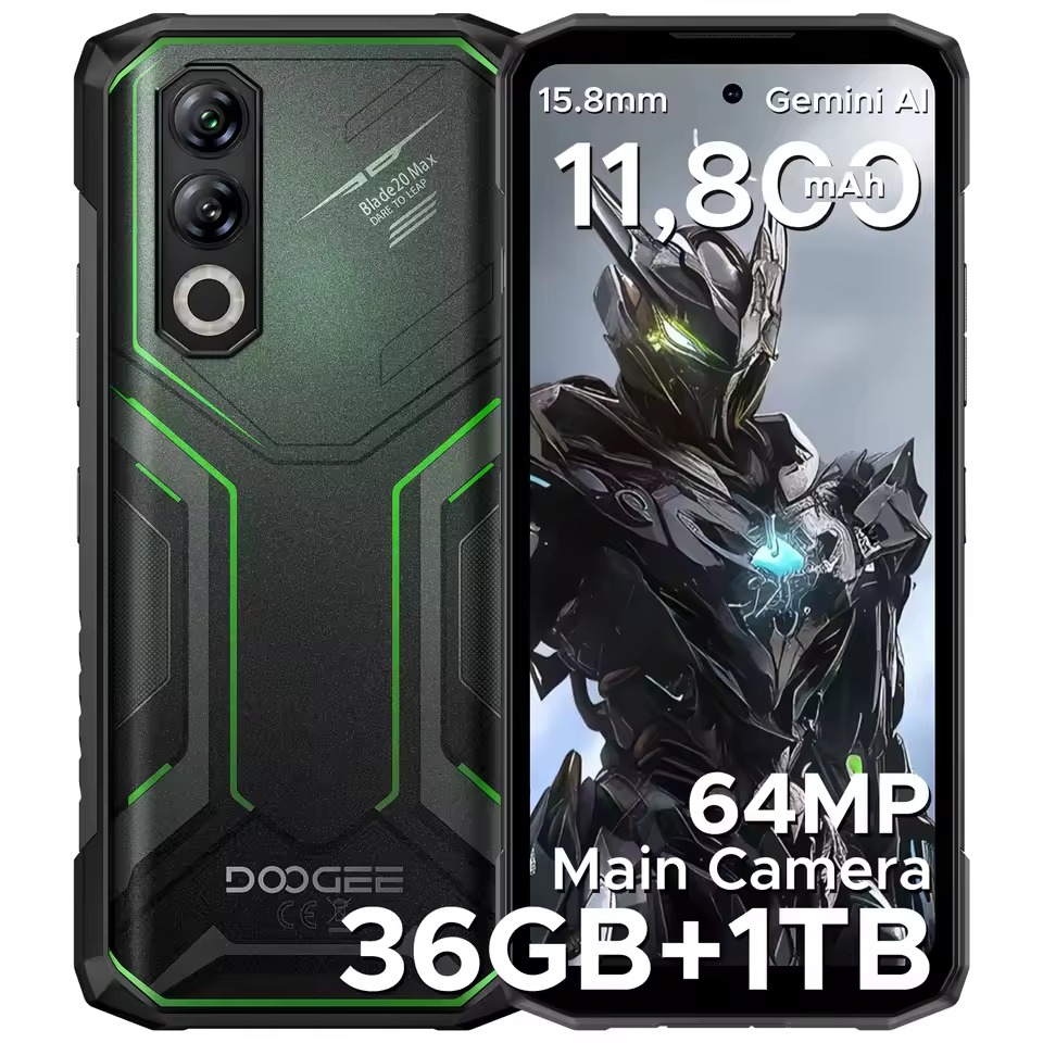 Doogee Blade 20 Max – aukštos klasės, vandeniui ir smūgiams atsparus 5G telefonas su itin talpia 11800 mAh baterija, užtikrinančia ilgą veikimą be įkrovimo. Įspūdinga 1 TB vidinė ir 12 GB RAM atmintis, 64 MP aukštos raiškos kamera, 20 MP naktinio matymo kamera, 120 Hz 6,8″ IPS ekranas bei greitas Helio™ G100 procesorius garantuoja sklandų veikimą. Android 15 operacinė sistema su lietuvių kalba. Stilingas tamsiai žalias korpusas su šviesiai žaliais akcentais (oficialiai „Žalias“).