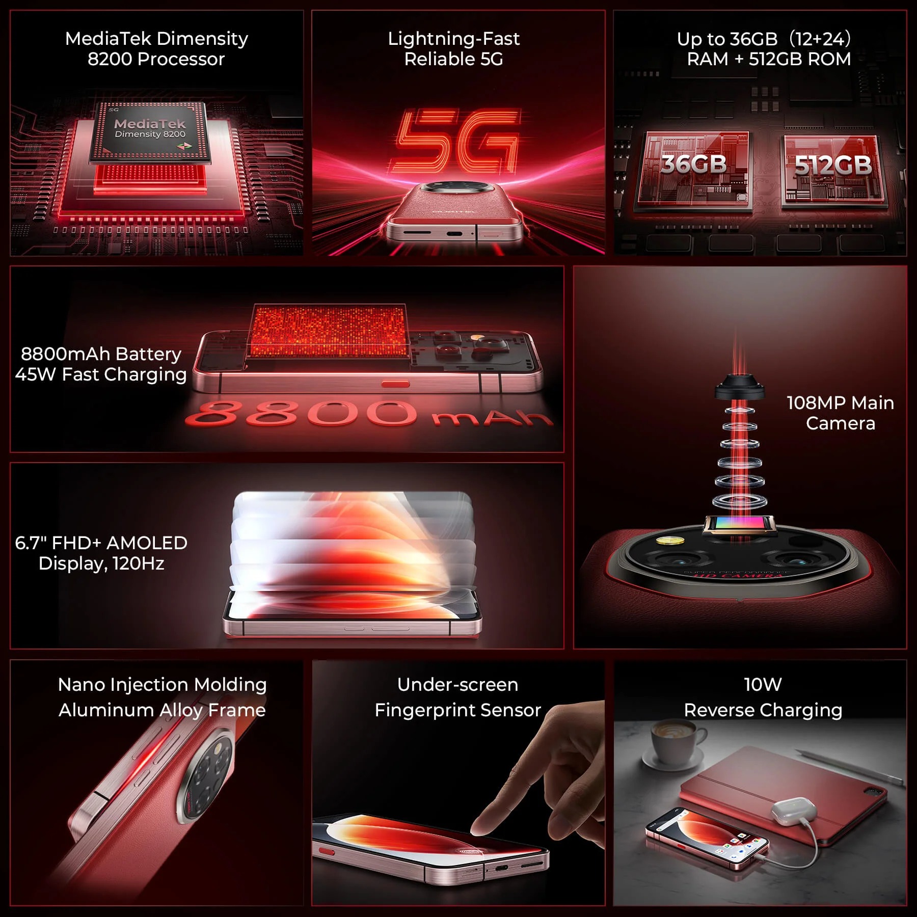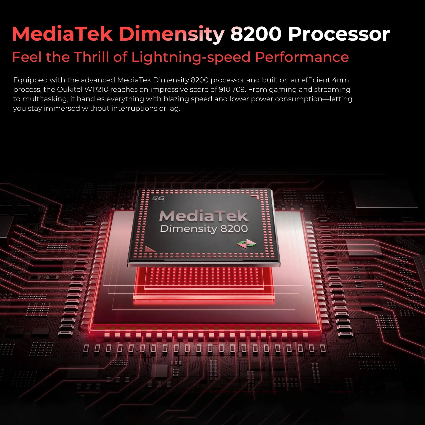 Oukitel WP210 – aukštos klasės vandeniui ir smūgiams atsparus 5G telefonas iš ilgametės Oukitel WP™ serijos. Telefonas stebina savo 512 GB vidine ir 12 GB RAM atmintimi, ypač ilgai be įkrovimo tarnaujančia 8800 mAh baterija, aukštos raiškos 108 MP kamera, 120 Hz 6,7″ IPS ekranu, ypač sparčiu Dimensity™ 8200 procesoriumi bei Android 15 operacine sistema su lietuvių kalba.